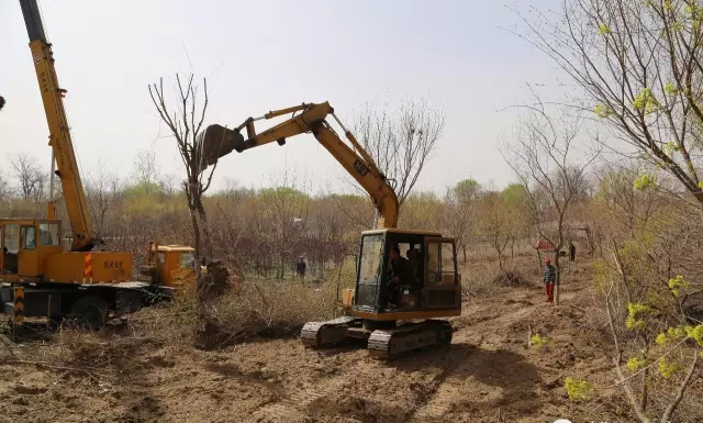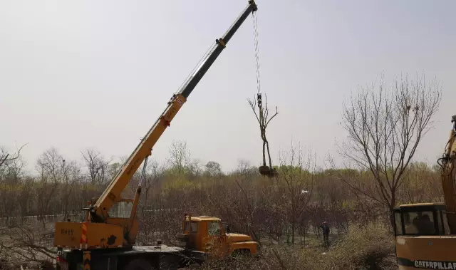在高升苗木基地廠區,首先映入眼簾的是一棵棵系著“紅頭繩”橫臥的元寶槭樹,一輛輛吊車正在慢慢吊起樹,緩緩地移出林區,吊裝入卡車,準備二次移植。所有被選中待移栽的樹苗都系上了“紅頭繩”,大家三個一組、五一個隊的圍在一起挖土起樹。起初,大家揮鍬挖土勁頭兒十足,坑越挖越大可是動作越來越慢,最后竟是小心翼翼的慢動作——清理樹根,原來這份“迅速”與“小心”是為了減少對樹苗的損傷,為提高移栽種苗的成活率做保障。技術人員說,每種樹木都有自己適應的環境,同是一個地方也有陰面陽面,背風沖風的區別,同一個樹種苗齡不一樣,對環境的適應能力也大有區別,所以選樹種要認真,起樹更要認真仔細。